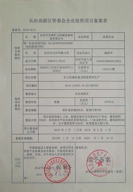 長治高新區管委會企業投資項目備案表